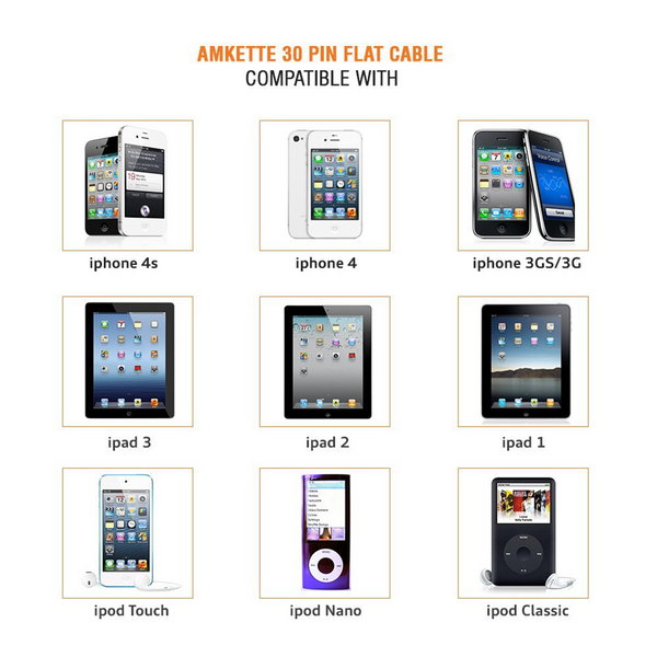 Sync and charge your iPhone, iPad or iPod with your computer or a wall mount Charger, using the Amkette 30 Pin to USB cable. The flat cable design provides flexibility and prevents tangles. The cable long in length, have wider compatibility and extra durable as it has been tested for 5000 bends.