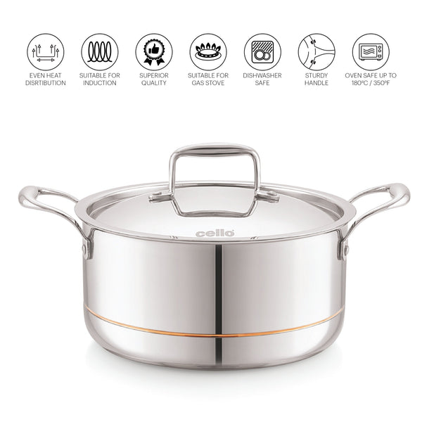 A 5-ply stainless steel casserole is a premium cooking vessel made from high-quality stainless steel material. Its 5-layer construction ensures even heat distribution for precise and efficient cooking. The casserole comes with a stainless steel lid, which helps seal in heat and moisture for flavorful results. Sturdy side handles offer a secure grip and convenient handling, even when the casserole is hot. This versatile casserole is perfect for slow cooking, braising, stewing, and preparing one-pot meals with ease. With its durable construction and exceptional performance, it is an essential addition to any kitchen.