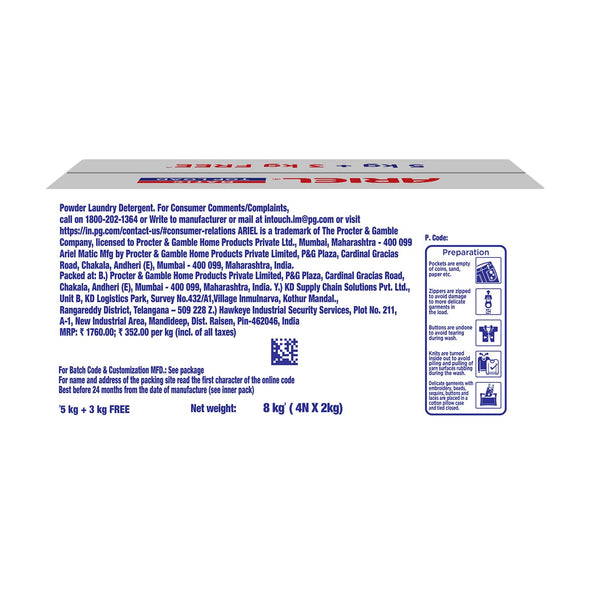 Details: New & Improved Ariel Matic gives you tough stain removal for a bright clean in just 1 wash. Especially designed to be used in top loading machines, Ariel Matic Top Load offers brilliant stain removal for full loads. The oxi-stain fighters for an impeccable clean wash after wash. It also provides deep down cleaning and long-lasting freshness. Formulated specifically for fully automatic washing machines, it generates the right amount of foam in the machine to deliver superior cleaning inside the machine itself, without damaging the machine due to excess foam. It requires just 1 scoop for normal loads, and 1.5 scoops for heavy loads, providing performance along with value. Ariel Matic’s cutting edge technology provides impeccable cleaning for all your clothes, and removes tough stains like juice, chocolate, tomato, and butter/ghee along with maintaining the brightness of the clothes. So now, say goodbye to stains and dullness!