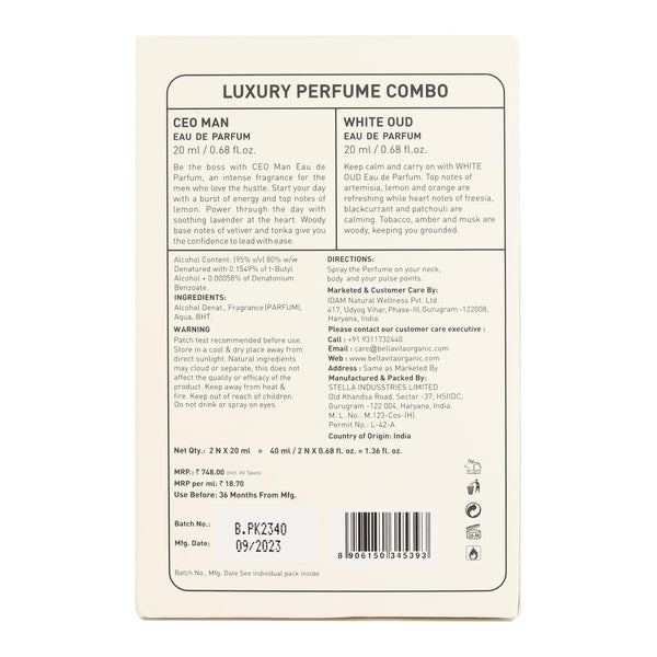 Bella Vita Luxury CEO Man & White Oud Unisex Perfume Combo with Tonka, Agarwood & Orange | Woody Long Lasting EDP Fragrance Scent, Pack of 2, 20 ml Each