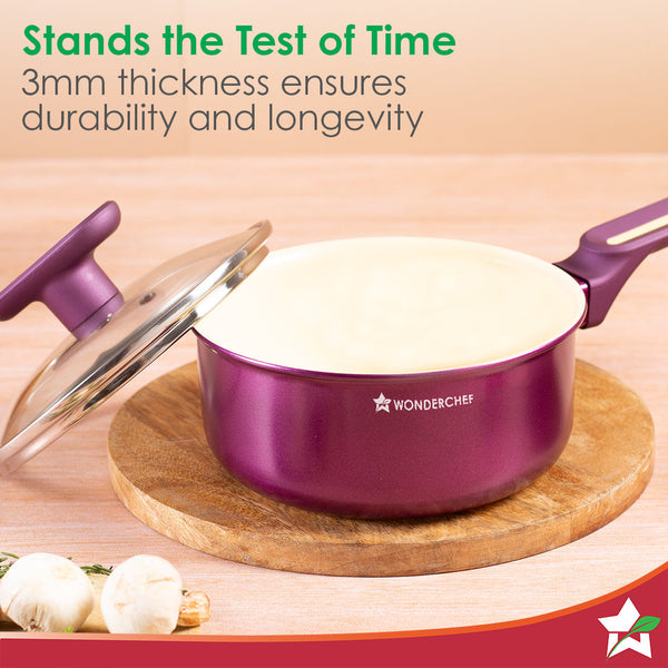 Bellagio Sauce Pan | 16 cm | 1.4 L | Non-Stick Ceramic Coating | Non-Toxic | Pure Aluminium | PFAS and PFOA Free | 3mm Thickness | Two-Tone Soft-Touch Handle and Knob | Firm Grip | 2 Years Warranty