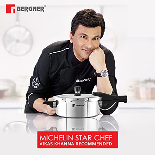 Details: Experience cooking with the Bergner Tri-ply UnPressure Cooker! The word “UnPressure” here represents that you enjoy cooking without any pressure because of its unique triple security system. Made of high-quality, triply material, it ensures minimum oil healthy cooking and also assures to be non-rustic. What is a tri-ply technology in Bergner Cookware?When a layer of aluminum is sandwiched between the two stainless steel layers of the cookware it is known as tri-ply technology. Moreover, the tri-ply technology contributes to even heat distribution that offers the best cooking results and 2X faster heating. Key Features: The pressure cooker lid comes with a safety lock system.2X faster heating v/s single ply. Conventional safety valves can be changed by easily using a kitchen grip. Gasket release system – unique notches designed for increased durability. Handle with a comfortable grip. Easy to open & close Significant savings on fuel Safety lock system – lets you open the cooker only when it is safe. The premium pressure cooker comes with a food-grade silicone gasket ring that offers a better grip & seal. What else?The premium cooker has ergonomic easy-grip handles that are designed to minimize physical effort and discomfort. Argent Triply UnPressure Cooker also has an inbuilt water level marking with specific measurements which helps to avoid overload or burning. The triply unpressured cooker delivers a 360° induction compatibility and saves 30% of your energy usage. For any product-related information or queries after its delivery, contact us at 1800-121-2206