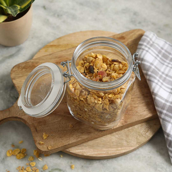 The Bormioli Fido range is high-quality, multipurpose, clear round glass jars that are ideal for storing spices, herbs, teas, jams, flour, crackers, snacks, pasta, coffee, rice, sugar, to smaller servings of cereal. You can even use it to store paper clips, bath salts and much more. The stainless steel buckle is adaptable, and helps in providing an air-tight secure seal preventing any leaks and helps to keep the contents fresh. Wide opening makes filling the jar and dispensing the contents very easy and avoids spillage. Available in set of 2.