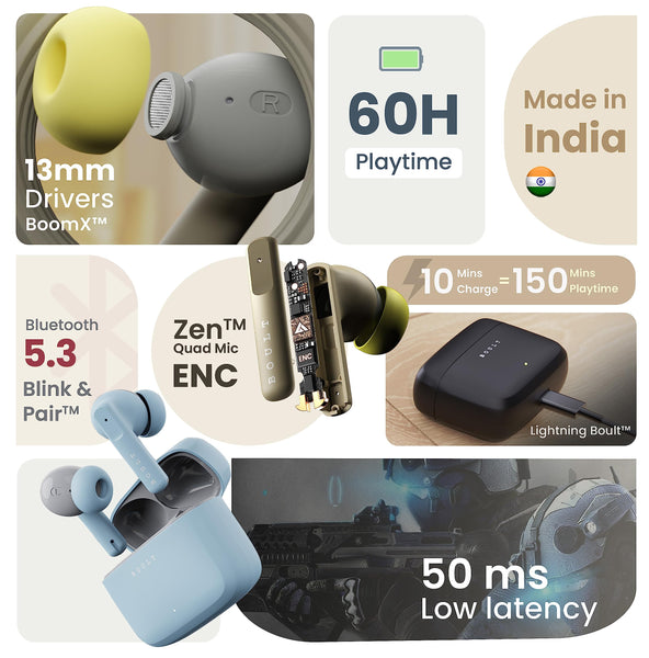 Boult Audio Z60 Truly Wireless in Ear Earbuds with 60H Playtime, 4 Mics ENC Clear Calling, 50ms Low Latency Gaming, 13mm Bass Driver, Type-C Fast Charging, IPX5 ear buds TWS Bluetooth 5.3(Powder Blue)