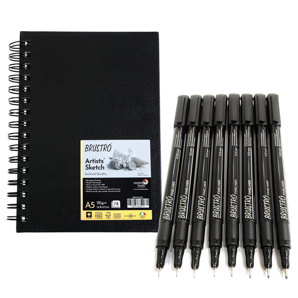 Brustro Professional Pigment Based Fineliner - Pack of 8 (Black) with Artist Sketch Book 110 GSM A5 Wiro Journal (156 Pages)