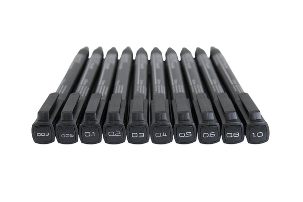 This set contains 10 fineliners which include: 0.03/0.05/0.1/0.2/0.3/0,4/0.5/0.6/0.8/1 mm (in black ink).
