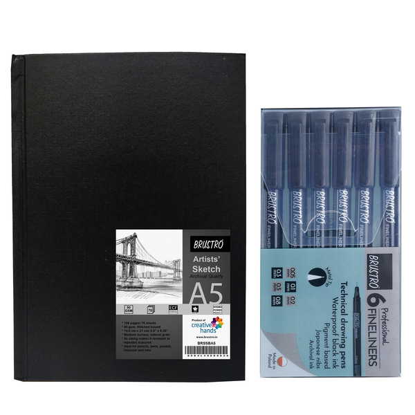 Elevate your artistic journey with the Brustro Artist’s Ultimate Sketching Combo, a premium pack that includes the BRUSTRO Professional Pigment-Based Fineliner Set of 6 (Black) and the Brustro Artists Stitched Bound Sketchbook (A5 Size). This expertly curated combo is perfect for professional artists, illustrators, and creative hobbyists who demand precision and quality in their work. The fineliner set features a range of tip sizes from 0.01mm to 0.8mm, offering versatility for fine detailing and bold outlines. Each pen is filled with archival-quality, water-resistant, and fade-proof pigment ink, ensuring your artwork remains vibrant over time. The 156-page sketchbook is crafted with 90 GSM acid-free paper, providing a smooth, bleed-resistant surface ideal for a variety of mediums, including pencil, ink, and markers. Its durable stitched binding allows it to lay flat for ease of use, and the compact A5 size makes it perfect for on-the-go sketching. With this combo pack, you have all the essentials to create stunning mandala designs, intricate sketches, and fluid illustrations with ease and style.