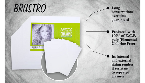 Brustro Sketching & Drawing papers are made of high-quality lignin-free and acid-free cellulose, guaranteeing long conservation over time. Produced with 100% of E.C.F. pulp (Elemental Chlorine Free). Its internal and external sizing renders it resistant to repeated erasures. It is recommended for artists and amateurs for sketching and drawing with pencil, charcoal, pastel, coloured pencil, and ink. It is also suitable for gouache. Brustro is a registered trademark of Creative Hands Art Materials Pvt. Ltd.