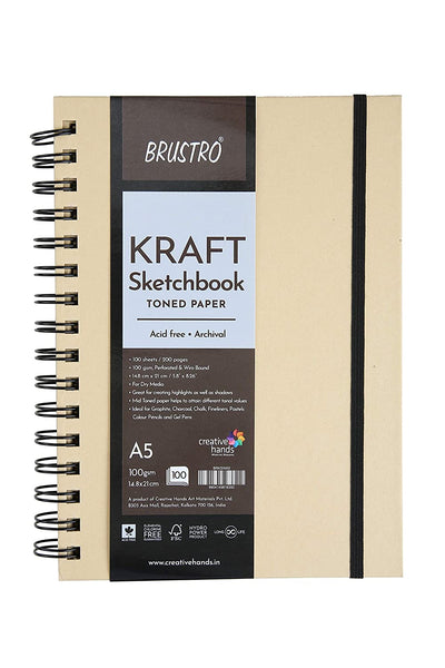 This Brustro Kraft Paper Sketchbook, Wiro Bound, is suitable for use with a variety of art mediums including pens and inks, pencils, charcoal, pastels and more. Each sheet is made using thick kraft paper to provide a sturdy base for your works. The sketch book is wiro bound and 100 gsm papers , 100 sheets