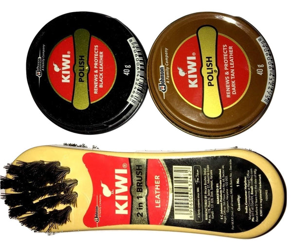 Kiwi Shoe Polish Paste (Black and Dark Tan, 40g) + Kiwi Leather Shine Brush - 1pc