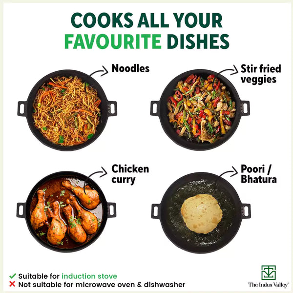 👌MULTI-PURPOSE COOKWARE: Cast iron cookware is designed to be multipurpose and ideal for daily use. Besides gas stove, you can use this wok kadai for induction cooktop, OTGs and campfires.