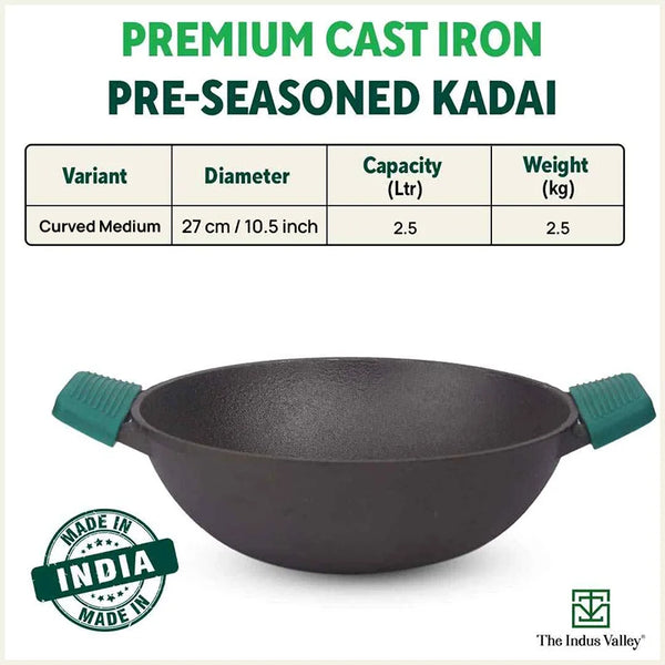 πNATURALLY NON-STICK: The cast iron kadhai is pre-seasoned with 100% vegetable oil which gives it a smooth finish. Buy this deep cast iron kadai online on The Indus Valley and be assured to get a superior performance with consistent cooking results.Β Β