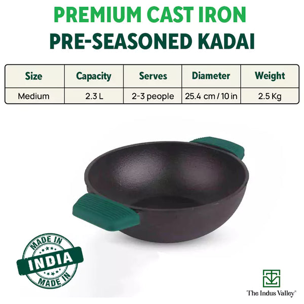 🌿100% NATURAL AND TOXIN-FREE: The Indus Valley’s Super Smooth Cast Iron Kadai is made from pure cast iron. This wok model kadai is thus is 100% natural; with no chemical coating. So, you don't have to worry about harmful chemicals releasing in food. Truly healthier choice than non-stick kadais!