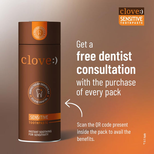 Details: What is tooth sensitivity? Tooth sensitivity occurs when the enamel that protects our teeth gets thinner or when gum recession occurs, exposing the underlying surface, the dentin thus reducing the protection of the root and nerves. When such teeth come in contact with something hot, cold, or sweet, sensations are carried directly to the nerves causing painful sensitivity. Causes for enamel wear and tear: Aggressive brushing, Tooth grinding, Teeth erosion Causes for gum erosion: Aggressive brushing, aging, gum disease. Clove sensitive toothpaste, provides RELIEF from tooth sensitivity with regular use. How to use: Use it like regular toothpaste, twice a day. Apply directly on sensitive teeth for relief. We recommend that you use a toothbrush specially designed for sensitive teeth along with this Clove Sensitive toothpaste. You can also explore the Clove Oral range of toothpaste.