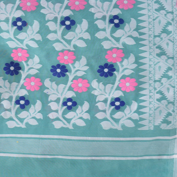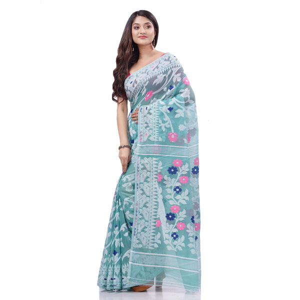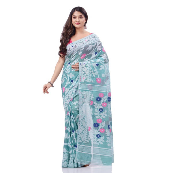 dB DESH BIDESH Women's Rangabati Resham Dhakai Jamdani Pure Cotton Handloom Saree Without Blouse Piece (Firoza, Multicolor)