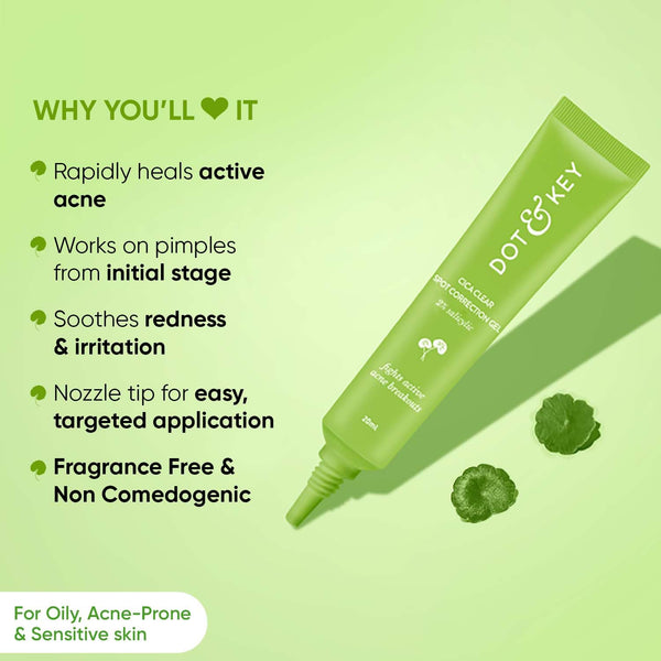 Dot & Key Cica Clear Spot Correction Gel for Active Acne | Soothing, Lightweight & Non Drying | Reduces Active Acne & Redness | Fades Acne Scars & Dark Spots | For Oily, Acne Prone Skin | For Women & Men | 20ml