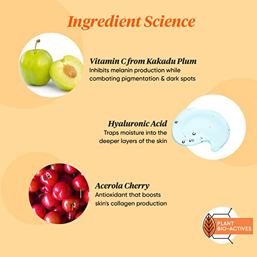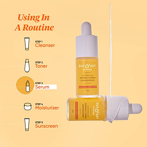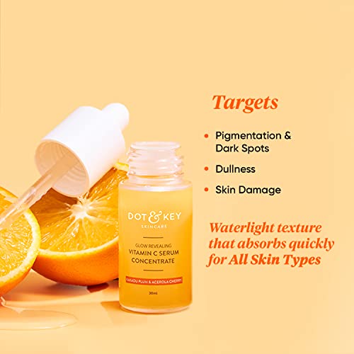 Details: Like your body and mind, your skin too gets tired after a long day's work. Hectic lifestyle and exposure to daily environmental aggressors can lead to pigmentation, dullness and accelerated signs of ageing. Supercharged with antioxidants and vitamin c from super fruits like kakadu plum and acerola cherry, Dot & Key glow revealing vitamin c serum concentrate aims to both prevent and correct the damage caused by these skin stressors. A concoction of potent ingredients, this vitamin c serum boosts collagen production, accelerates repair and smoothens expression lines. With stable vitamin c in a weightless, quick absorbing, water base formula, this serum actively illuminates the complexion and eliminates dullness and dark spots by neutralizing free radicals. Infused with moisture magnet hyaluronic acid, this vitamin c serum for face provides intense hydration restoring skin's plumpness. It contains no nasty chemicals and is completely safe and gentle on skin. The result? A noticeably brighter, more radiant complexion, with signs of ageing and photo damage minimised. Add it to your beauty routine to make skin less fatigued and more luminous.