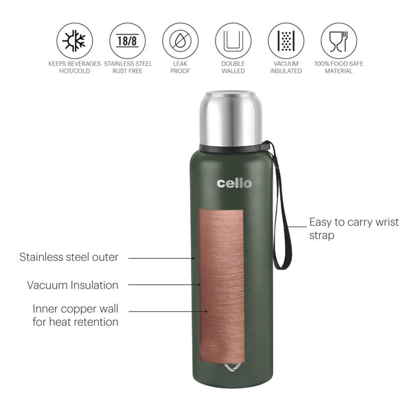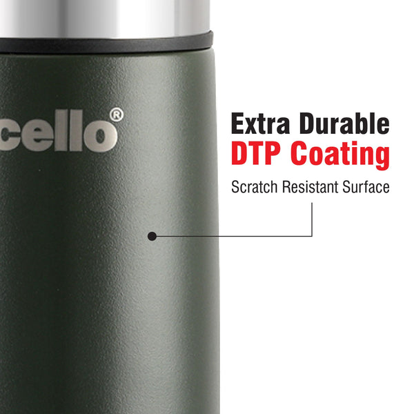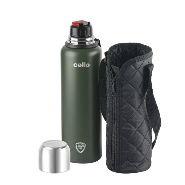 Introducing the Duro Flip Flask Vacusteel Water Bottle with a Thermal Jacket, designed for the adventurous spirit in you. Whether you're heading out on treks, hikes, cycling, going to the gym, school, or the office, this flask is your reliable companion. Crafted with advanced DTP coating, its vibrant colors won't fade or scratch with everyday use, ensuring it looks brand new even with wear and tear. This double-wall insulated water bottle keeps hot liquids piping hot and cold beverages ice cold. The unique DTP coating enhances its appearance, and Vacusteel technology with a copper-coated interior ensures prolonged temperature retention. It's leak-proof, odor-free, and its compact design makes it perfect for an outdoorsy lifestyle, whether you're hiking, trekking, camping, playing sports, hitting the gym, or embarking on other adventures. Carry it with ease in the included pouch and embrace an active lifestyle with a bottle that stands the test of time.