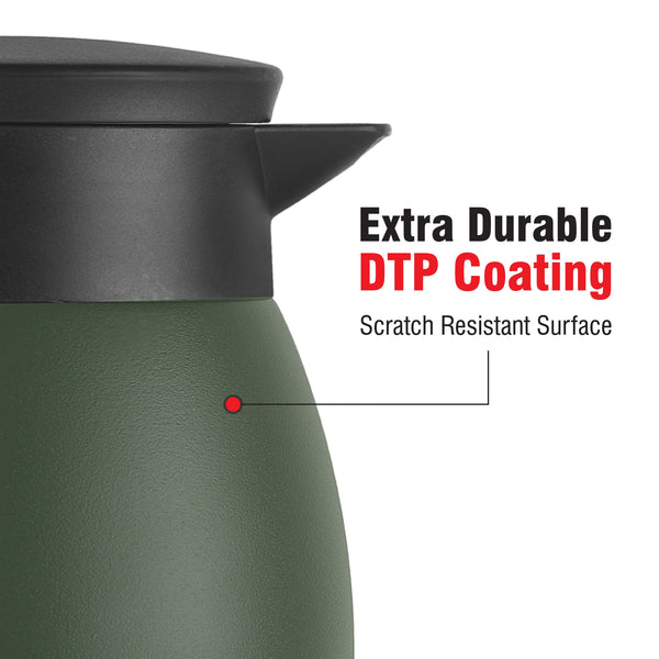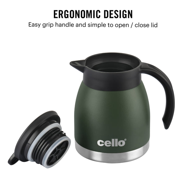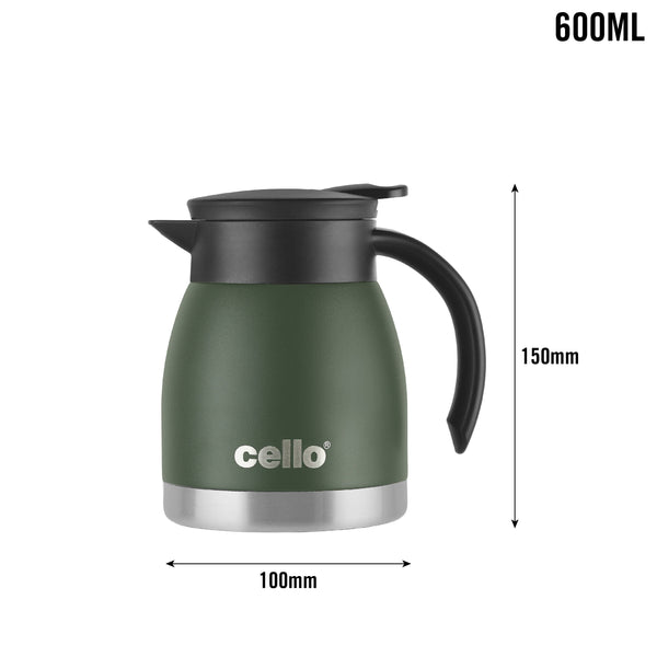 Cello Duro Pot Double Walled Vacuum Insulated Teapot is a must-have for coffee enthusiasts seeking a stylish and functional solution. With a substantial 600ml capacity, this teapot is the ideal choice for those who appreciate a significant amount of coffee. Crafted from premium stainless steel and equipped with cutting-edge vacuum insulation technology, it excels at maintaining the perfect temperature while preserving the rich flavor and freshness of your brew, ensuring it stays hot or cold for an extended period. The convenient push-button pour spout allows for effortless one-handed serving, making it a hassle-free option for any occasion, whether it's a corporate event, a birthday celebration, or a casual breakfast with friends