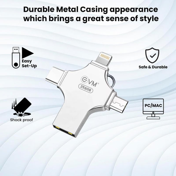 EVM EnStore 4-in-1 OTG 256GB Flashdrive-High-Speed USB 3.0 with Read Speed of 100Mb/s & Write Speed of 25Mb/s-Transfer Files Between USB-A,All Smartphones - (EVM4D/256G)