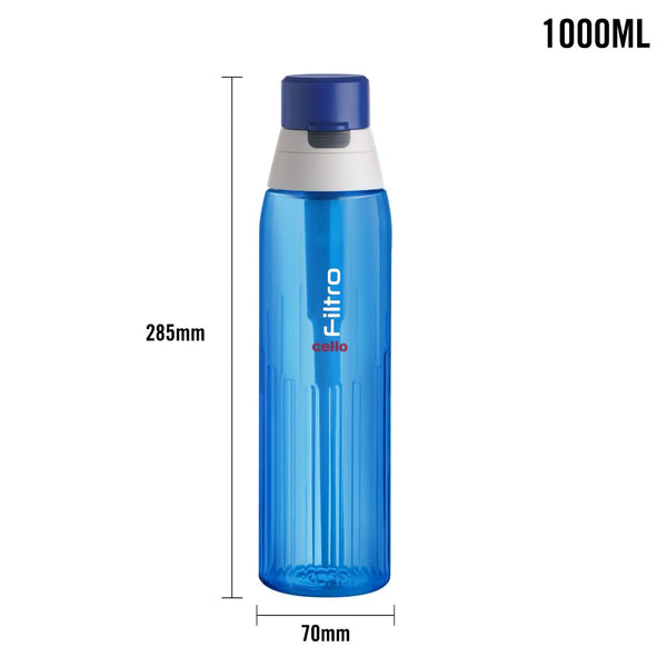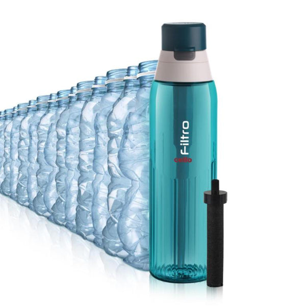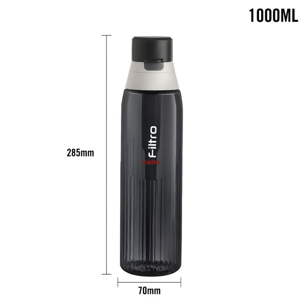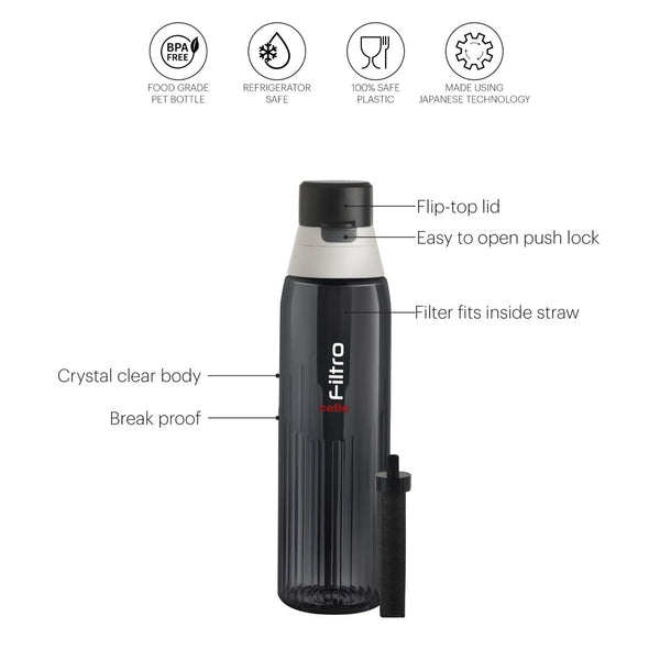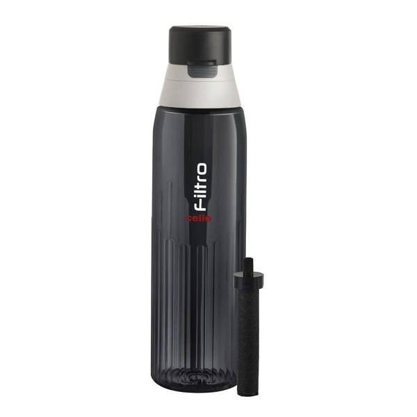 Hydrate and filter in style! The Cello Premium Filtro bottle has a replaceable carbon filter that removes the taste and odor of chlorine from potable tap water. Made from BPA-free plastic, this stylish water bottle is suitable for your everyday life. Available in many colors. Rehydrate & replenish anywhere, anytime with Cello Filtro Water Bottle With Activated Carbon Filter. It makes potable tap water, stream water & even rain water safe to drink. Its ideal for school going kids, travelers, hikers & everyone who likes to go camping, trekking etc.