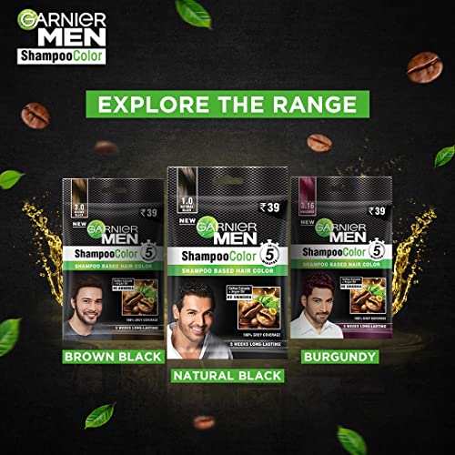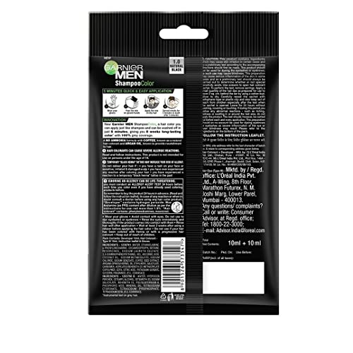4x Garnier Men, Liquid Hair Colour, 100% Grey Coverage, Shampoo Color, 1.0 Natural Black, 10ml+10ml (Pack of 4)