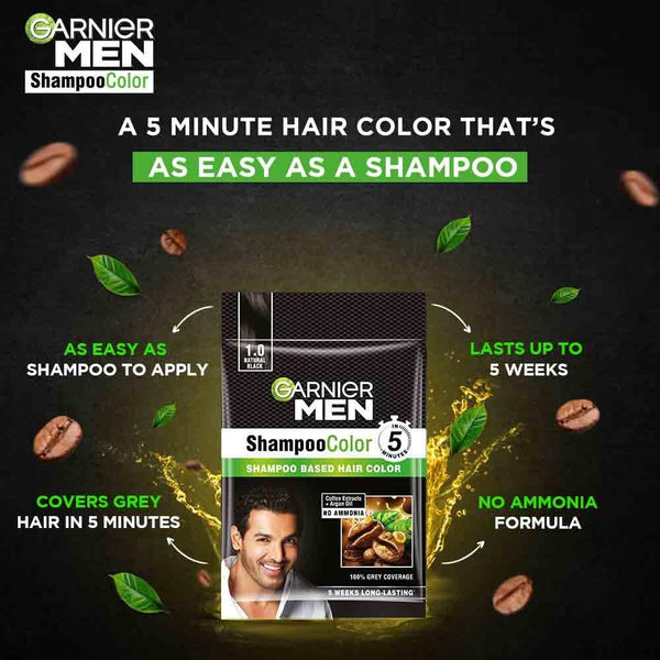 Details: Experience a quick and easy way to color your hair with Garnier Men Shampoo Hair Color in Shade BROWN BLACK. This hair color shampoo is designed to provide a natural, long-lasting black shade that covers grey hair effectively. It's enriched with nourishing ingredients that protect hair from damage while giving it a natural, vibrant look. Ideal for men seeking a hassle-free coloring experience, this pack of 5 ensures you always have a reliable solution on hand. Simply apply, rinse, and enjoy refreshed, younger-looking hair with a natural black finish.