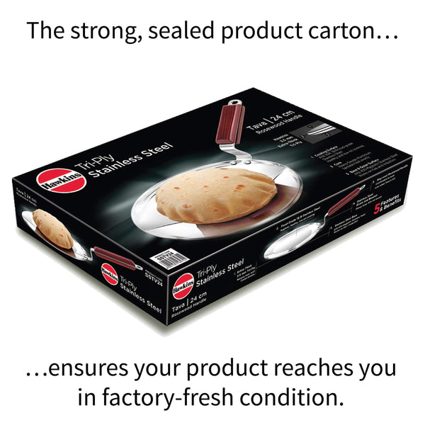Details: Hawkins Tri-ply Stainless Steel Tava is designed to give you all the advantages of cooking in stainless steel while minimizing the disadvantages of sticking and burning that are normally associated with ordinary stainless steel. The cooking surface (inner surface) is made from 18/8 food-grade (AISI 304) stainless steel which is extremely hygienic, most durable, does not react with most foods and does not pit or corrode. The heavy gauge aluminium core spreads heat well for even cooking with no hot spots, and retains heat for quick cooking. It is sandwiched between two layers of stainless steel and does not come in contact with food on the cooking surface. The base (outer surface) is made of AISI 430 grade magnetic stainless steel. Hence this cookware can be used on all domestic gas, induction, electric, ceramic and halogen cooktops. Hawkins tri-ply stainless steel Tava is durable, well-balanced and stays flat for quick cooking on gas, induction and electric cooktops. The 3.5 mm extra thick tava has a unique shape with a flat base and gentle sloping sides has just the right curvature for optimal cooking results - oil does not pool, nor spill over the sides. The placement of the rivets is carefully designed to maximise the cooking area. The strong Rosewood stay-cool handle is comfortable and safe to hold even when the tava is hot.