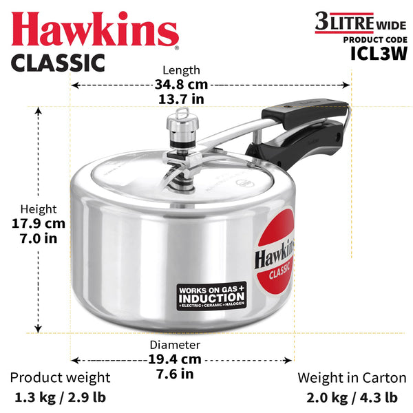 Details: The Classic is Hawkinsβ largest-selling, most popular range of pressure cookers β perhaps because of its attractive combination of features, benefits and price. Each Hawkins Classic features an inside-fitting lid. This design is inherently safer than conventional cookers. Thus Hawkins Classic pressure cooker is pressure-locked for safety β like a jetliner door! This range was the first to be introduced by Hawkins and has been kept fresh and current by numerous innovations and improvements over the years. The latest improvement is a 3.25 mm new improved induction base and a superior pressure regulating system that controls pressure to a narrower, more efficient range, reduces sprouting of frothy foods (such as dal) and is easier to insert and remove. The safety valve is located under the lid handle bar so that when it operates the steam is safely deflected downwards. The gasket has minimum exposure to steam inside the cooker, does not rub every time the product is opened and closed β so lasts longer. Stay-cool handles. Fixed sturdy pivot does not put pressure on the plastic handles as it is a part of the metal handle itself. Thus handles last longer. Recommended for use on gas, electric, halogen, ceramic and induction cooktops.