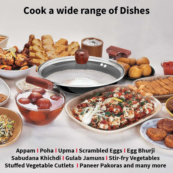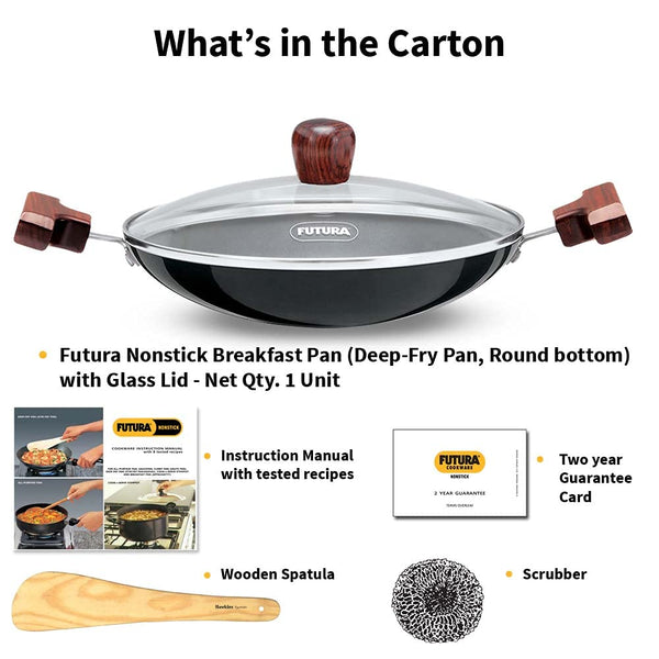Hawkins FUTURA 0.9 Litre Breakfast Pan with Glass Lid, Nonstick Cookware, Appachatty, Chetty Pan, Appam Patra, Round Bottom Kadai, Black (NBFP09G) - 217 mm