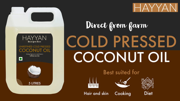 HAYYAN Cold Pressed Coconut Oil - Own Farm Unrefined for Cooking, Skin, Hair & Baby massage (Chekku/Ghani) - 5 Litres