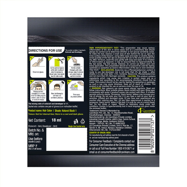 Indica Easy Do-It-Yourself 10 Minutes Hair Color Shampoo with 5 Herbal Extracts and 100% Ammonia Free, Long Lasting Formula, (12.5g + 12.5ml) - Natural Black Colour (Gloves Included)