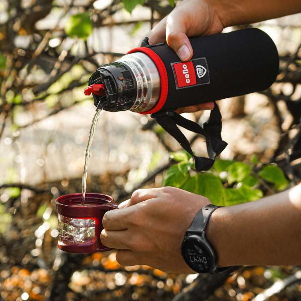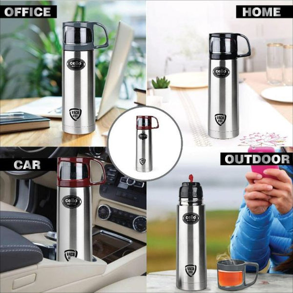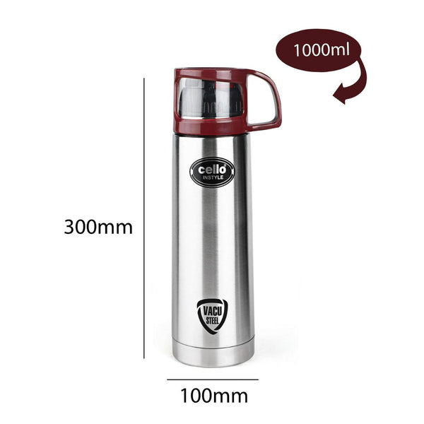 Introducing the Instyle Flask, a 1000ml Vacusteel Water Bottle by Cello, designed to cater to your beverage needs all year round. This stainless steel flask is your perfect companion during scorching summers and freezing winters, thanks to its thermo seal technology and vacuum insulation. With this special feature, it retains the temperature of your drink, keeping hot beverages hot and cold ones refreshingly chilly for extended periods. Its wide mouth easily accommodates ice cubes, and the robust cap ensures a tight seal, preventing any leaks and eliminating the need for constant water reheating. This flask also comes with a smart jacket/pouch for extra protection, adding convenience to your hydration routine. Made with high-quality steel and inner copper coating, it excels in heat retention, and its 100% vacuum-insulated stainless steel body maintains beverage temperatures effectively