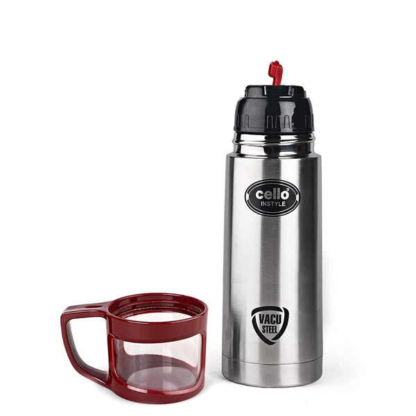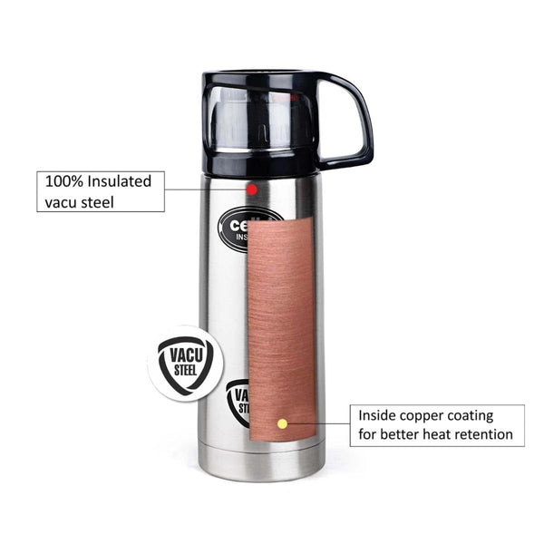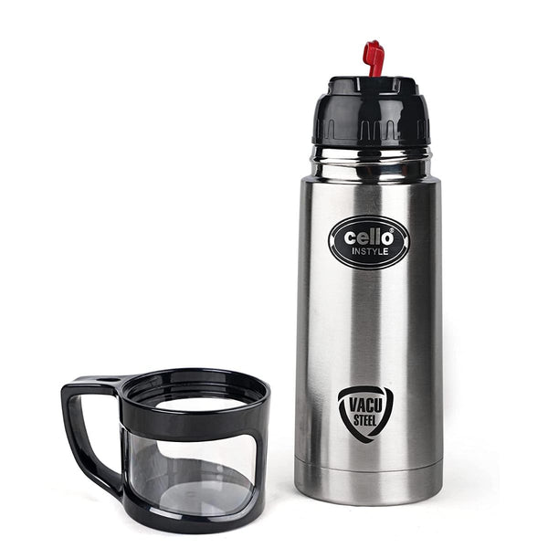 Introducing the Instyle Flask, a 350ml Vacusteel Water Bottle by Cello, designed to cater to your beverage needs all year round. This stainless steel flask is your perfect companion during scorching summers and freezing winters, thanks to its thermo seal technology and vacuum insulation. With this special feature, it retains the temperature of your drink, keeping hot beverages hot and cold ones refreshingly chilly for extended periods. Its wide mouth easily accommodates ice cubes, and the robust cap ensures a tight seal, preventing any leaks and eliminating the need for constant water reheating. This flask also comes with a smart jacket/pouch for extra protection, adding convenience to your hydration routine. Made with high-quality steel and inner copper coating, it excels in heat retention, and its 100% vacuum-insulated stainless steel body maintains beverage temperatures effectively