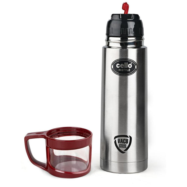 Introducing the Instyle Flask, a 750ml Vacusteel Water Bottle by Cello, designed to cater to your beverage needs all year round. This stainless steel flask is your perfect companion during scorching summers and freezing winters, thanks to its thermo seal technology and vacuum insulation. With this special feature, it retains the temperature of your drink, keeping hot beverages hot and cold ones refreshingly chilly for extended periods. Its wide mouth easily accommodates ice cubes, and the robust cap ensures a tight seal, preventing any leaks and eliminating the need for constant water reheating. This flask also comes with a smart jacket/pouch for extra protection, adding convenience to your hydration routine. Made with high-quality steel and inner copper coating, it excels in heat retention, and its 100% vacuum-insulated stainless steel body maintains beverage temperatures effectively