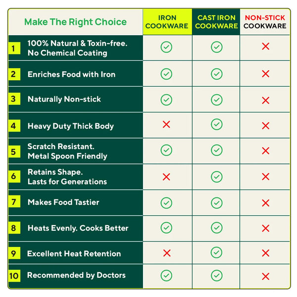 💪100% NATURAL AND FOOD-SAFE: The Indus Valley Iron Tawa (square) with double Bakelite handle is the best alternative to non-stick tawa. It is 100% natural and completely food-safe.