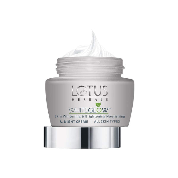 The weather and pollution can wreak havoc on your skin, especially facial skin which is always exposed. It can result in uneven pigmentation, dark spots and dullness. Lotus Herbals White-Glow Skin Whitening and Brightening Nourishing Night Crème is a cream that works through the night to reduce pigmentation and adds glow to your skin.This cream lightens, whitens, and brightens your skin. It is an advanced formula containing fruit and herbal extracts that reduces pigmentation and nourishes skin overnight. In the morning, your face is light, white, and glowing.
