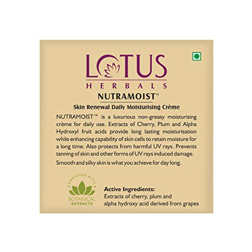 Details: Lotus Herbals NutraMoist Skin Renewal Daily Moisturising Creme is a luxurious non greasy moisturising cream with SPF for daily use. Extracts of cherry, plum and alpha hydroxile fruit acids provide long lasting moisturisation while enhancing capability of skin cells to retain moisture for a long time. It prevents tanning of skin and protects the skin from other forms of UV rays induced damage. Smooth and silky skin is what you achieve for all day long.