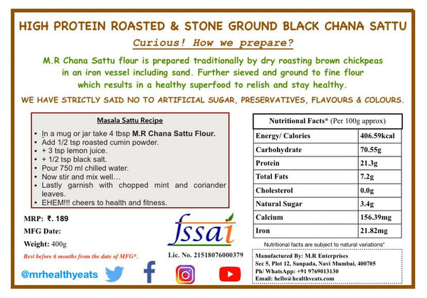 M.R Healthy Eats- High Protein, Roasted & Stone Ground Black Chana Sattu in Food-Grade Container (400g)