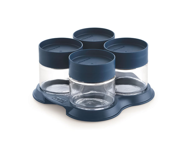 The Cello Modustack Glassy Tray Gift Set, featuring five pieces in blue and maroon, consists of four airtight glass jars with a coordinating tray. These wide-mouth jars are effortless to clean and use, designed for stacking convenience with non-slip rims on the unbreakable plastic lids. Ideal for storing an array of snacks like candy, cookies, and nuts, this set is also a perfect choice for gifting.