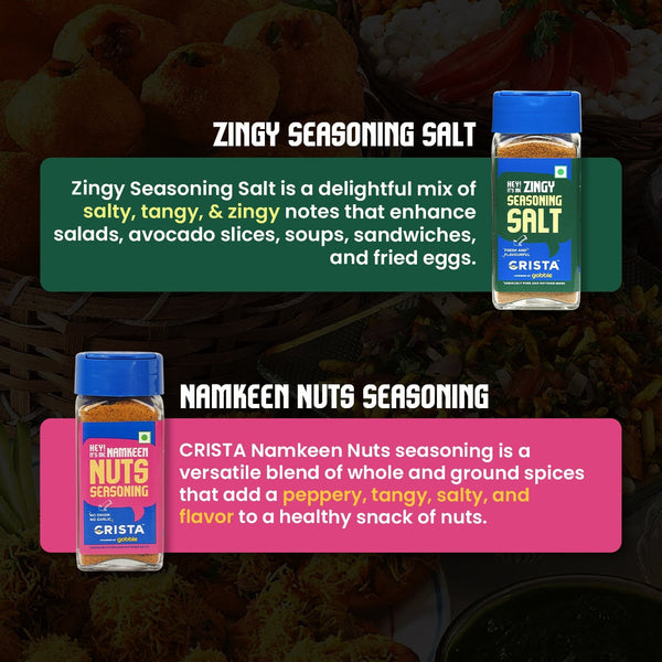 Enjoy the zesty and savoury flavours of our special combo this monsoon season. Sip on some masala chai, teamed up with pakoras sprinkled with Zesty Chilli Lime Seasoning, or a bowlful of boiled peanuts with a little Nameen Nuts Seasoning or Chaat Masala on top. Whip up a platter of family favourites and uplift every rainy evening with special delights from CRISTA with our monsoon combo!