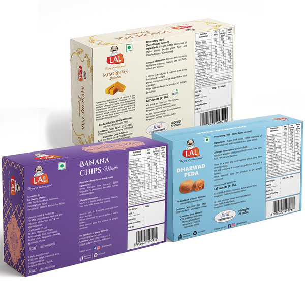 Mysore pak signature 400g, Dharwad peda 400g, Banana chips masala 250g