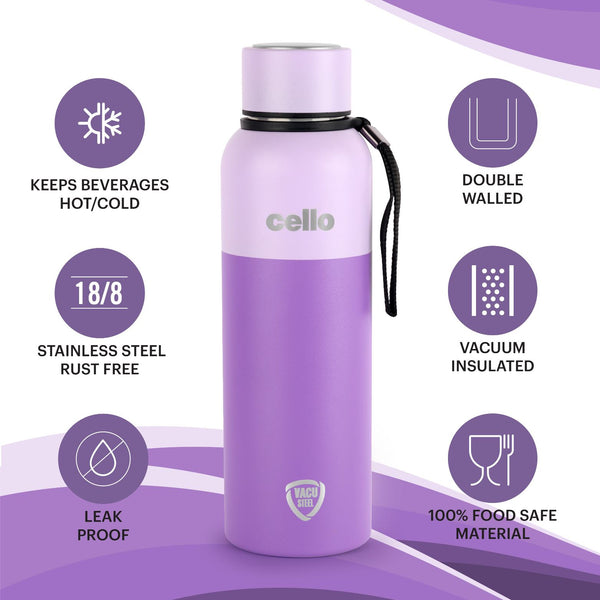 Neo Kent Flask, Vacusteel Water Bottle 750 ml dual tones collection is the epitome of style and functionality. Stay hydrated in vibrant colors, from the soothing Blue to the nature-inspired Green and the elegant Peach. With a sleek Black option, timeless Grey, and a touch of royalty in Purple, there's a shade for every taste. Crafted with precision using Vacusteel technology, this 750 ml water bottle ensures your beverages stay at the perfect temperature for longer. Elevate your hydration experience with Neo Kent, where design meets performance.