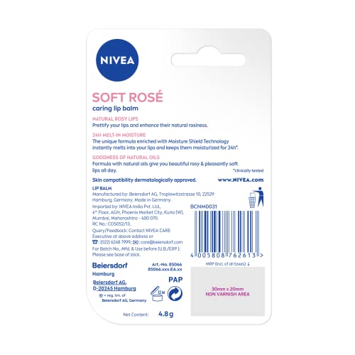 NIVEA Soft Rose Shine 4.8g Lip Balm|24 H Melt in Moisture Formula|Natural Oils|Glossy Finish,4.8 g (Pack of 1)