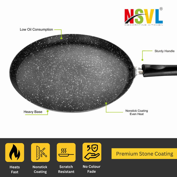 Details: Granite Finish Non-Stick Coating: The tawa features a durable non-stick coating with a granite finish, ensuring that your dosas cook evenly without sticking to the surface. This unique coating not only enhances the tawa's aesthetic appeal but also makes it easy to release dosas with minimal oil. Durable Construction: Built with high-quality materials, this dosa tawa is designed to withstand daily use and provide long-lasting performance. The sturdy construction ensures even heat distribution for consistently crispy dosas. Ideal Size: The tawa comes in an ideal size for preparing perfect dosas. The spacious cooking surface allows you to spread the dosa batter evenly, ensuring uniform cooking and a delectable texture. Heat-Resistant Handle: The tawa features a heat-resistant handle that stays cool to the touch, providing a comfortable grip while flipping or serving dosas. The handle is securely attached, ensuring stability and safety during use. Easy to Clean: Cleaning up is a breeze with the non-stick granite finish. Simply wipe off any residue with a soft cloth or sponge, and the tawa is ready for your next culinary adventure. It is also dishwasher safe for added convenience. Versatile Use: Apart from dosas, this tawa is versatile enough to cook various other dishes like uttapams, omelets, crepes, and more. Expand your culinary repertoire with this multi-functional cookware. Stylish Design: The granite fInish not only adds a touch of sophistication to your kitchen but also makes the tawa an attractive serving piece. Cook and serve with style.