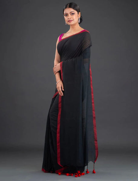 OISHANI SAREE GHOR Women's Traditional Bengal Cotton Handloom Black Saree, (OSG_Black_138)
