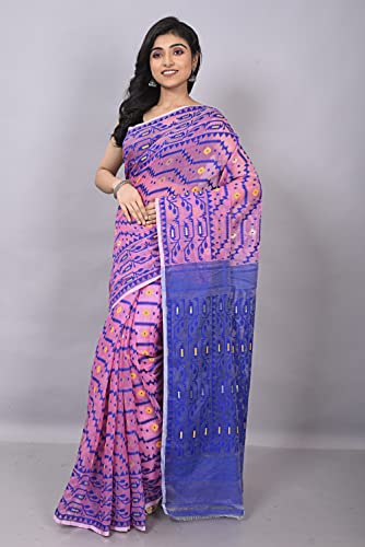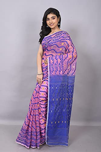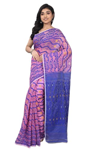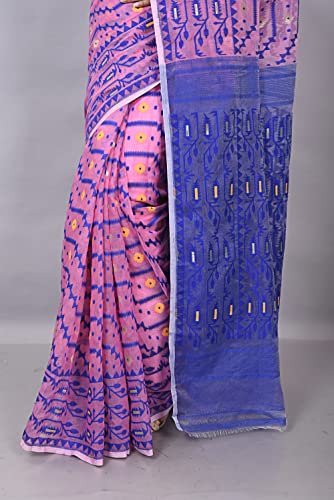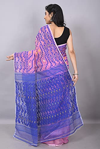OISHANI SAREE GHOR Women's Traditional Bengal Cotton Resham Nakshi Design Jamdani Saree (Pink Blue)