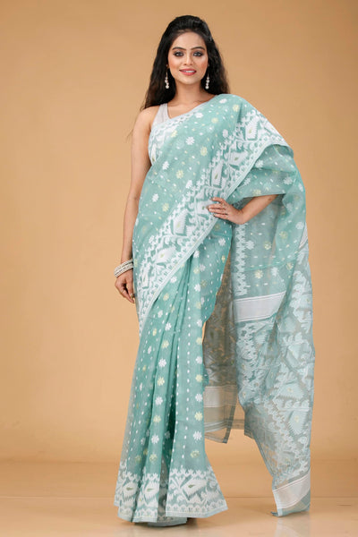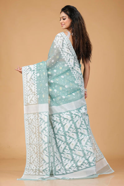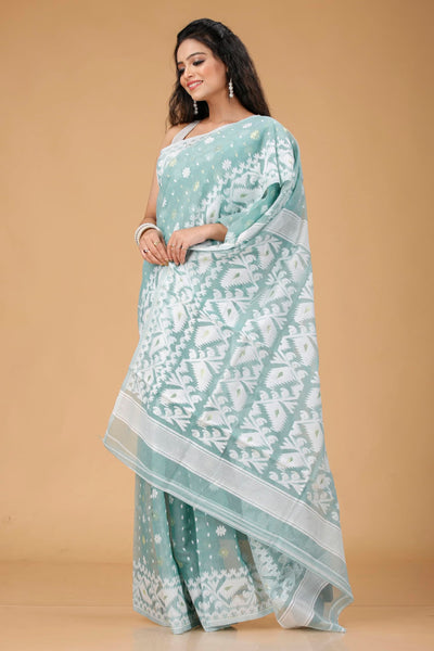 OISHANI SAREE GHOR Women's Traditional Bengal Cotton Silk Soft Jamdani Saree - Beautiful design and Quality - Without Blouse Piece (Pastel Turquoise)