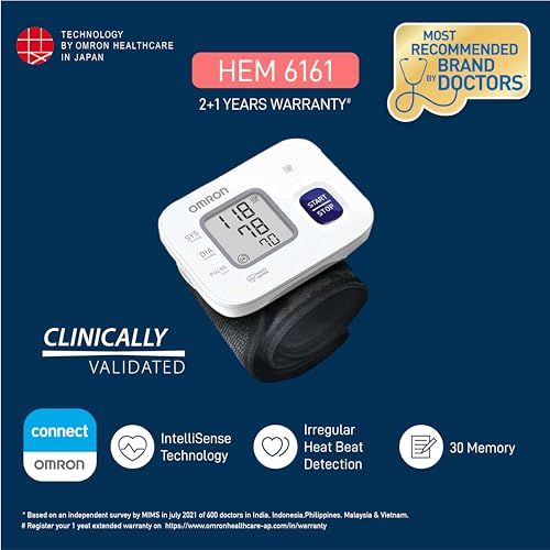 Omron HEM 6161 Fully Automatic Wrist Blood Pressure Monitor with Intellisense Technology, Cuff Wrapping Guide and Irregular Heartbeat Detection for Most Accurate Measurement (White)
