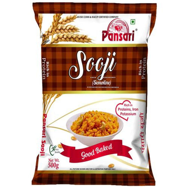 Sooji is also known as Semolina is the light and coarse form of durum wheat and is highly accepted for a simple and rich breakfast. Made from the finest quality wheat, Pansari Sooji is a super healthy source of protein and fiber. It is a great product that helps in reducing the risk of diabetes and to control higher blood sugar levels. Not only this but it is also good for bone health, heart and is high with innumerable nutritional values. Pansari Sooji is skilfully packed in a 500g packet to keep its freshness and quality intact. Full of natural ingredients, it is a versatile product to go with your diet and can be easily digested. It contains no preservatives and chemicals and is an ideal product to use everyday. Store it in a cool and dry place, away from sunlight.